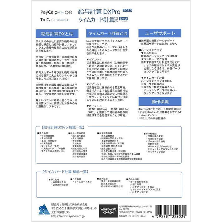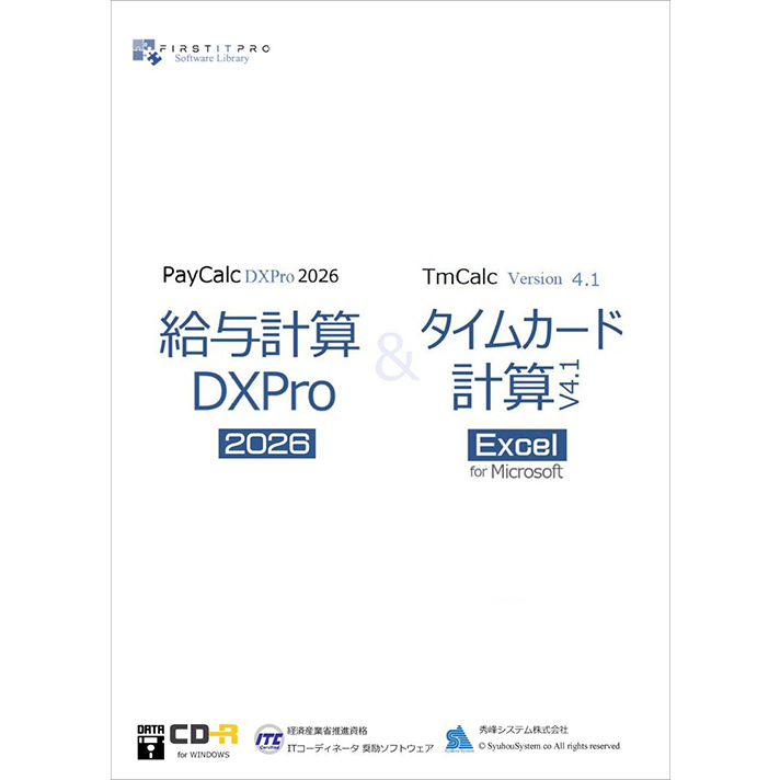 この商品は「給与計算DXPro2026」と「タイムカード計算 for EXCEL」のセット商品です。タイムカード計算から給与計算、年末調整までをトータルにサポートします。セット価格ですのでお買い得ですよ。